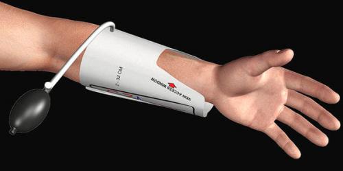 این ابزار که توسط دکتر پری و در کارگاه خانگی اش طراحی و ساخته شده، مانند یک یک فشار سنج است که توسط پمپ بادی پر می شود و یک منطقه دریچه ای برای رگ یابی دارد. حالت قاب مانند اطراف این قسمت باعث می شود پوست در جای خود ثابت بماند و کار رگ گیری به مراتب راحت تر شود.